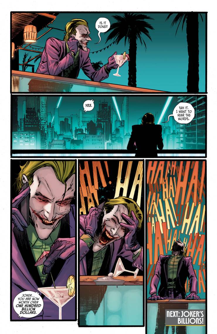 Il numero seguente vide Bruce in fuga, ricercato per appropriazione indebita di milioni di dollari, mentre Joker sequestrava i suoi numerosi beni, incluse le Wayne Enterprises. Mentre questo serviva solo a rafforzare la determinazione di Bruce ad abbattere la sua nemesi, Batman #95 rivela che Joker è continuamente un passo avanti al suo nemico, arrivando a comprare il Monarch Theatre – fuori dal quale Thomas e Martha Wayne sono stati uccisi per qualche piano nefasto. Batman, da parte sua, si dirige in una delle sue Batcaverne secondarie all’interno di un edificio della Wayne Enterprises, dove trova Punchline ad aspettarlo. La nuova spalla del Joker rivela di aver torturato Lucius Fox per scoprire l’ubicazione delle Batcaverne secondarie dell’eroe. Tuttavia, quando il libro mostra quel brutale interrogatorio, Punchline afferma che Joker ora vale “quasi cento miliardi di dollari.”