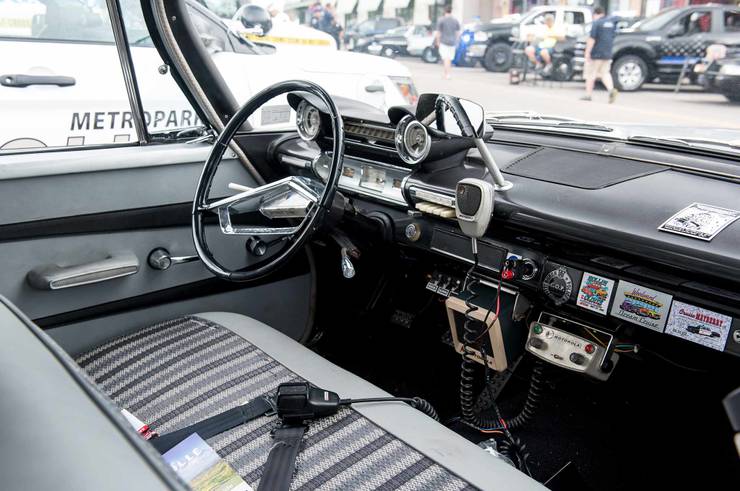 往年のダッシュボードは、この美しいオールズモビル88で実現します。 CBラジオなどの典型的な装備はありますが、私たちの目を引くのは、明らかに部屋の中の象のほかに、警官が運転中に携帯する必要がないように、中央に取り付けられた小さなクリップボードです。 また、パトロール中に不審な車番があった場合、ちょっとしたメモをすることもできます。 クリップボードの上には、小さなライトも付いています。